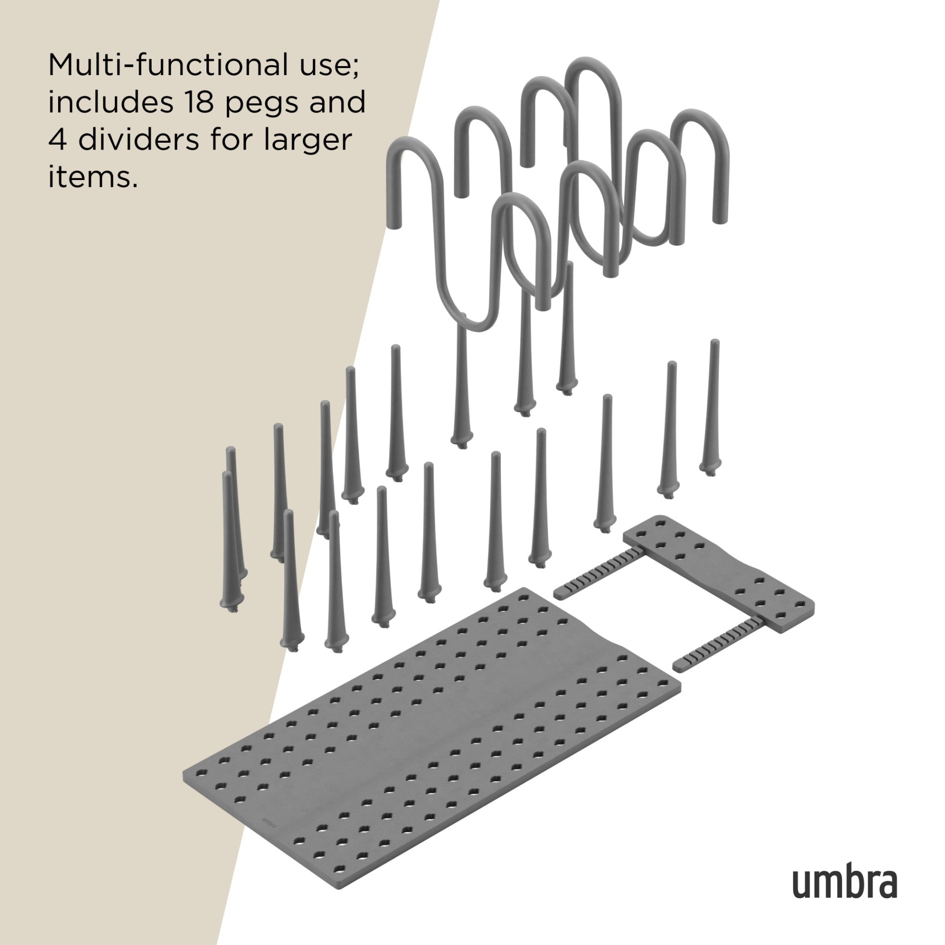 Introducing the Peggy Cookware Organizer – the ultimate solution for keeping your kitchen neat and your cookware easily accessible. Designed with functionality and style in mind, Peggy Cookware Organizer eliminates the hassle of stacking and unstacking, offering a seamless and organized way to store your pots, pans, lids and more. Extends to fit any unique cabinet space with its adjustable base and configurable pegs. It helps to keep heavy pots, pans and their lids upright, visible and easily accessible. Peggy Organizer includes 18 pegs and 4 peg extensions to store all your cookware, no matter how large. Simply twist the pegs to secure them into the base – no tools or hardware required.