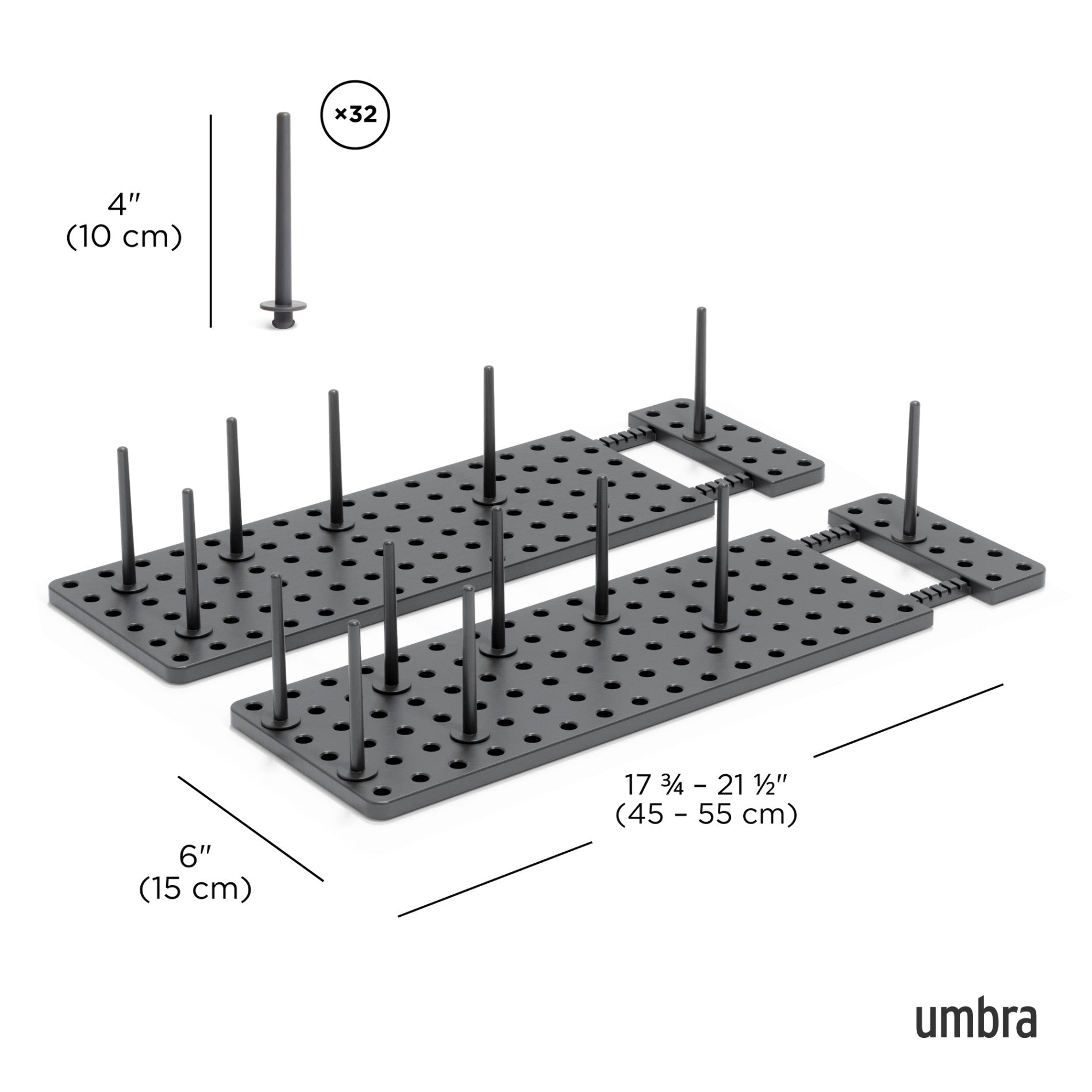 What makes Peggy unique is the adjustable tray and removable pegs that can be repositioned at any time. You choose where to place them based on your needs which means you can create the perfect fit to accommodate your plastic food storage containers and lids, your mixing bowls, your cooking utensils and just about anything else you want to keep organized and in its place. With a matrix of 108 holes and a total of 32 pegs included, there's literally hundreds of available configurations which means nearly limitless storage possibilities. To ensure a perfect fit, each base can be extended up to an additional 3.25 inches and comes equipped with non-slip feet to ensure Peggy stays put. Measures 21.5 x 6 x 4 inches (55 x 15 x 10 cm). Made with recycled plastics. Recommended for lightweight dishware.